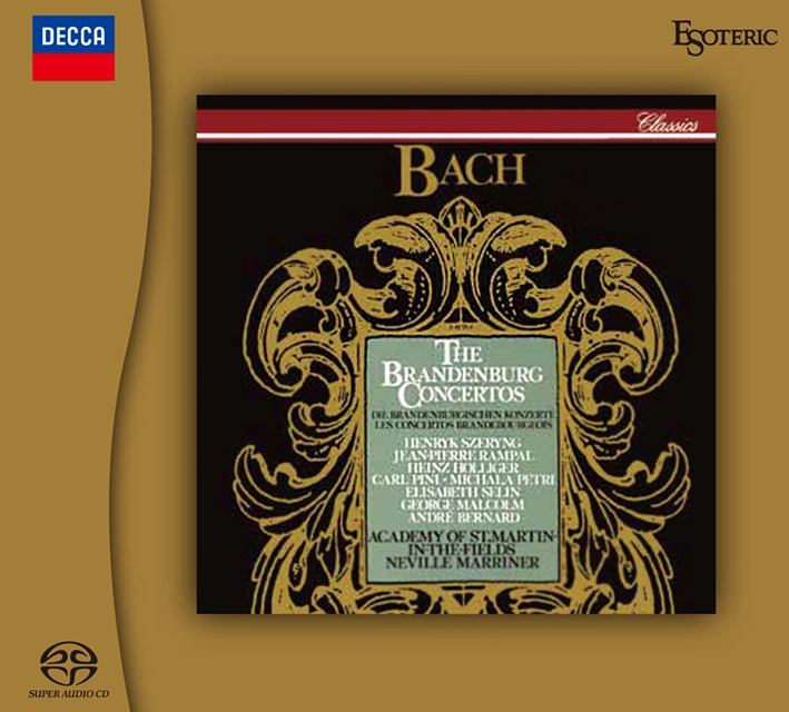 Die Academy of St. Martin in the Fields wurde 1959 von Sir Neville Marriner und einer Gruppe fuehrender Londoner Orchestermusiker ins Leben gerufen. Urspruenglich als kleines Streichensemble ohne Dirigent gegruendet, war sie Vorreiterin der Barockrenaissance in den 1960er Jahren und hat mit Sir Neville Marriner ein schnell wachsendes Repertoire aufgenommen und aufgefuehrt, mit ueber 500 Aufnahmen. Die Jahre 1717 bis 1723, in denen Bach im Dienste von Prinz Leopold am Hof in Koethen stand, waren fuer Bach besonders produktiv, und einige seiner bekanntesten Werke stammen aus dieser Zeit – unter anderem auch die “Brandenburgischen Konzerte”. Diese stellen einen Hoehepunkt in der Geschichte des Barockkonzerts dar und gehoeren zu den weltweit am meisten bewunderten Kompositionen von Bach. Er schrieb diese Gruppe von sechs beliebten Concerti grossi im Auftrag des Markgrafen von Brandenburg, daher auch der Titel. Die Neuauflage von Meisterwerken der klassischen Musik durch Esoteric hat weltweit viel Aufmerksamkeit erregt. Das kompromisslose Engagement fuer die Wiederherstellung und Bearbeitung der urspruenglichen Baender sowie die Verwendung der Hybrid-Super-Audio-CD-Technologie zur Verbesserung der Klangqualitaet machen die Veroeffentlichungen von Esoteric zum Pflichtprogramm und audiophilen Genuss fuer alle Liebhaber der klassischen Musik! Doppel-Hybrid-SACD (Dual-Layer) in limitierter Auflage! Japanische Pressung. Conductor: Sir Neville Marriner Orchestra: Academy of St. Martin in the Fields Henryk Szeryng: violin Jean-Pierre Ranpal: flute Heinz Holliger: oboe Michala Petri: recorder Recording: 1-7 December 1975 (4) & 13-16 January 1978 (9) at Lukaskirche, Dresden, Germany